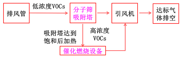 針對無組織的低濃度VOCs廢氣,乙戈采用高性能分子篩蜂窩吸附低濃度VOCs,待吸附達(dá)到飽和,再將VOCs脫附,然后催化燃燒,這樣減少持續(xù)催化燃燒消耗的能量,達(dá)到節(jié)能的目的。其“吸附+脫附+催化燃燒”技術(shù)方案如圖1所示。